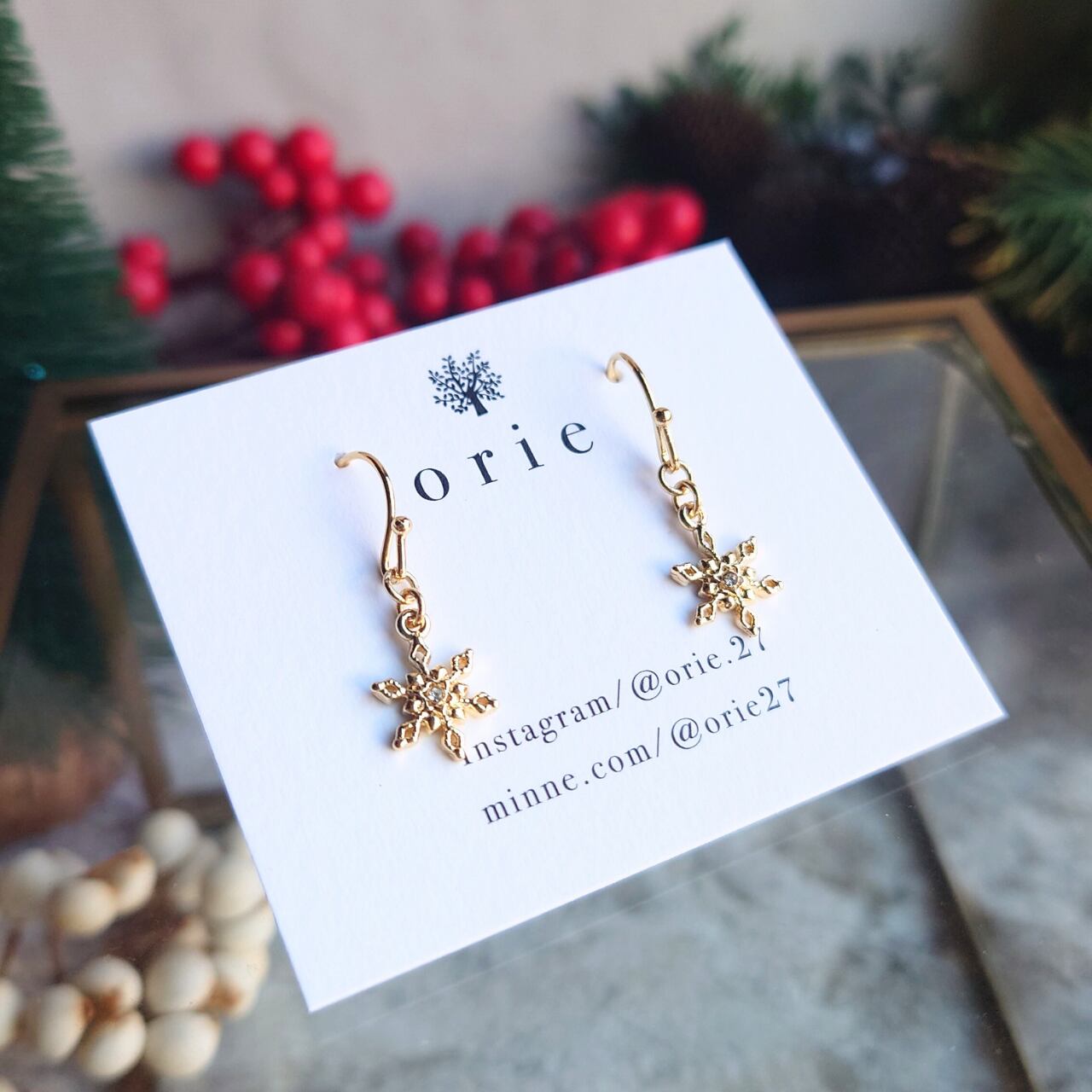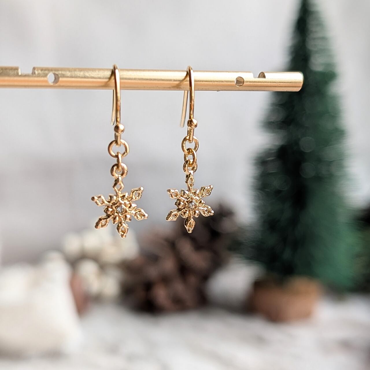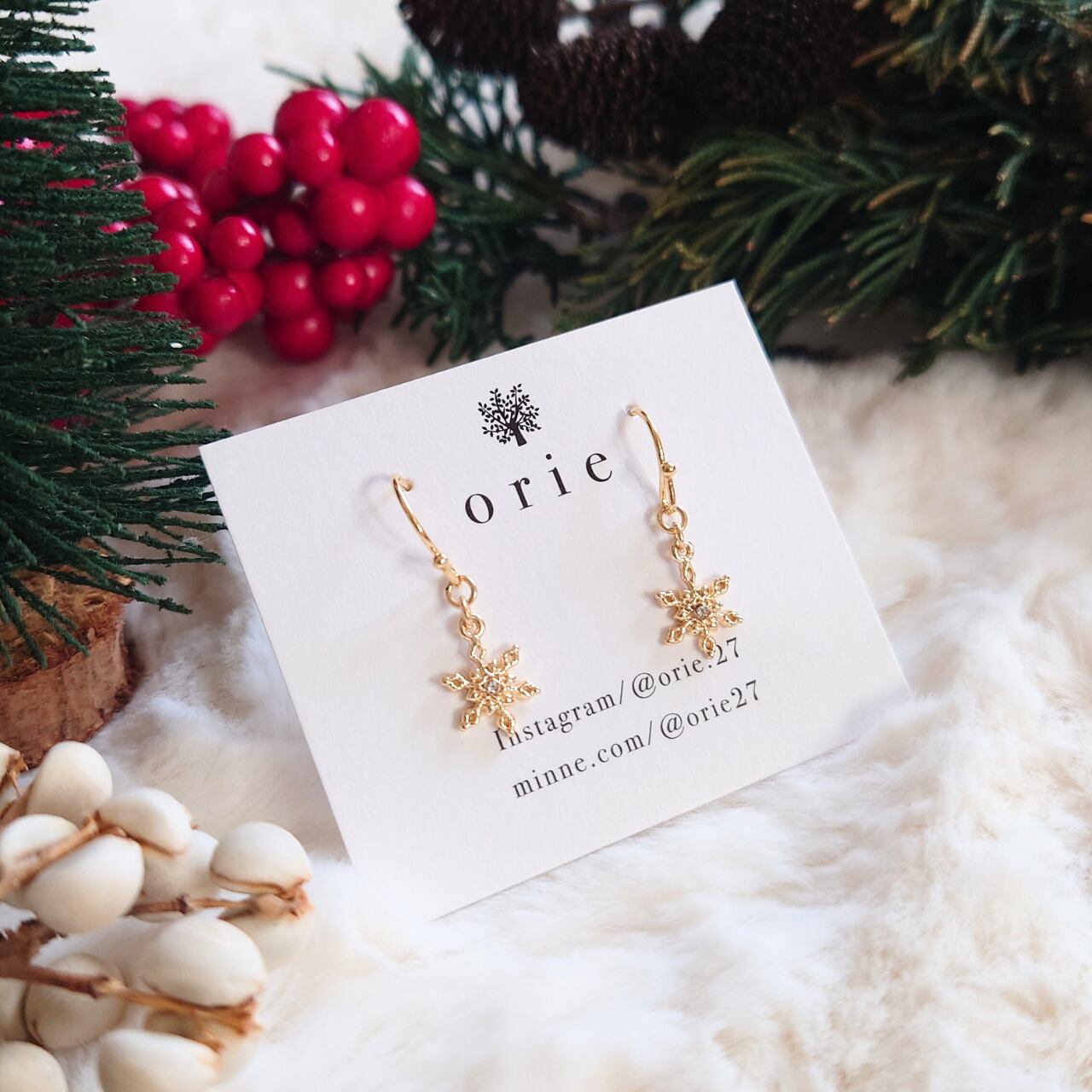 耳元で輝く雪の結晶が